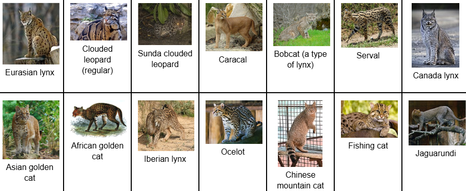 There are 41 “cat” species, or species in the family Felidae. I could only name 10 or so off the top of my head: Lion, tiger, jaguar, cougar, cheetah, leopard, snow leopard, bobcat, lynx (let’s say Canada lynx), and of course domestic cat. But there’s another 31, most of which I’ve never heard of! Many, like bobcats, are somewhere between a house cat the big guys. I like thinking about this category, the medium-sized wild cats. They’re out there, sleeker and deadlier and usually cooler looking than your home puss, in the woods or mountains silently stalking and hunting and napping and raising little kittens. And we, going about our silly human lives, have no idea, we don’t even know most of them exist. Many of these species aren’t even endangered!